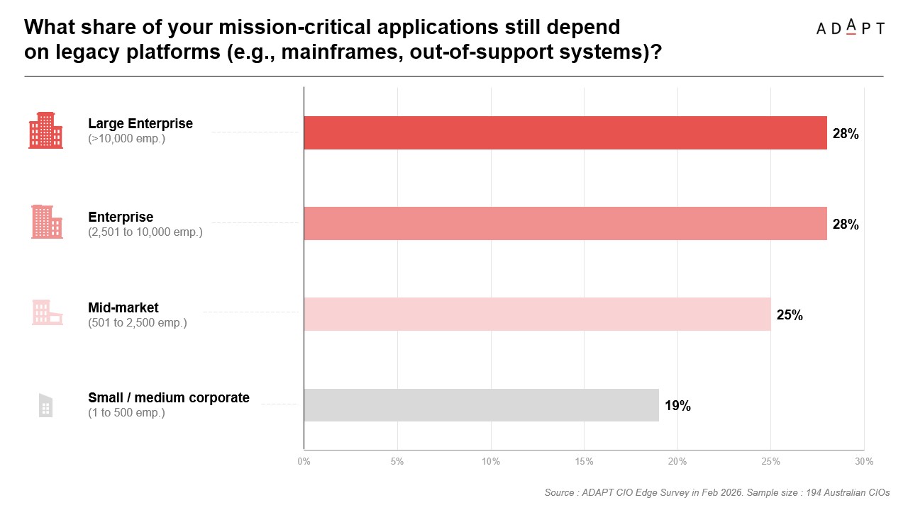 A meaningful share of mission critical applications still depend on legacy platforms across every organisation size, ranging from 19% in large enterprise to 28% in mid market and small to medium corporate environments.