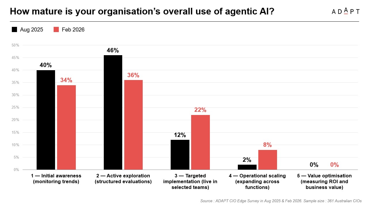 ADAPT’s CIO Edge data shows organisations moving out of early awareness and active exploration into targeted implementation and early operational scaling.