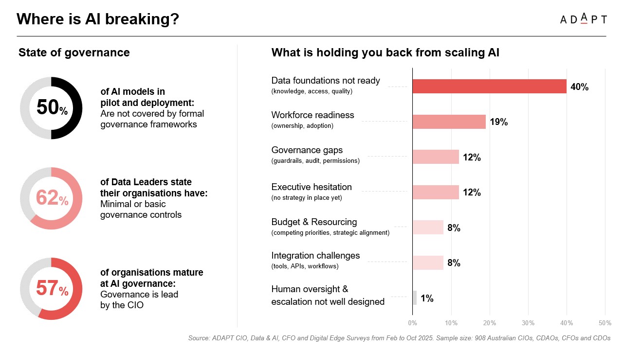 When ADAPT asked what is holding organisations back from scaling AI, data foundations not ready ranked first at 40%, followed by governance gaps at 19% and workforce readiness at 12%.