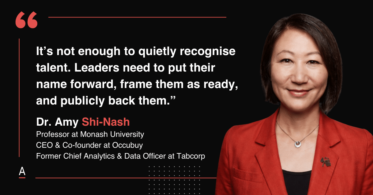 Dr Amy Shi Nash, Professor at Monash University, CEO and Co-Founder at Occubuy, former Chief Data and Analytics Officer at Tabcorp, described how quickly careers can accelerate when a leader backs you publicly, before you have “earned” a long history of internal visibility.