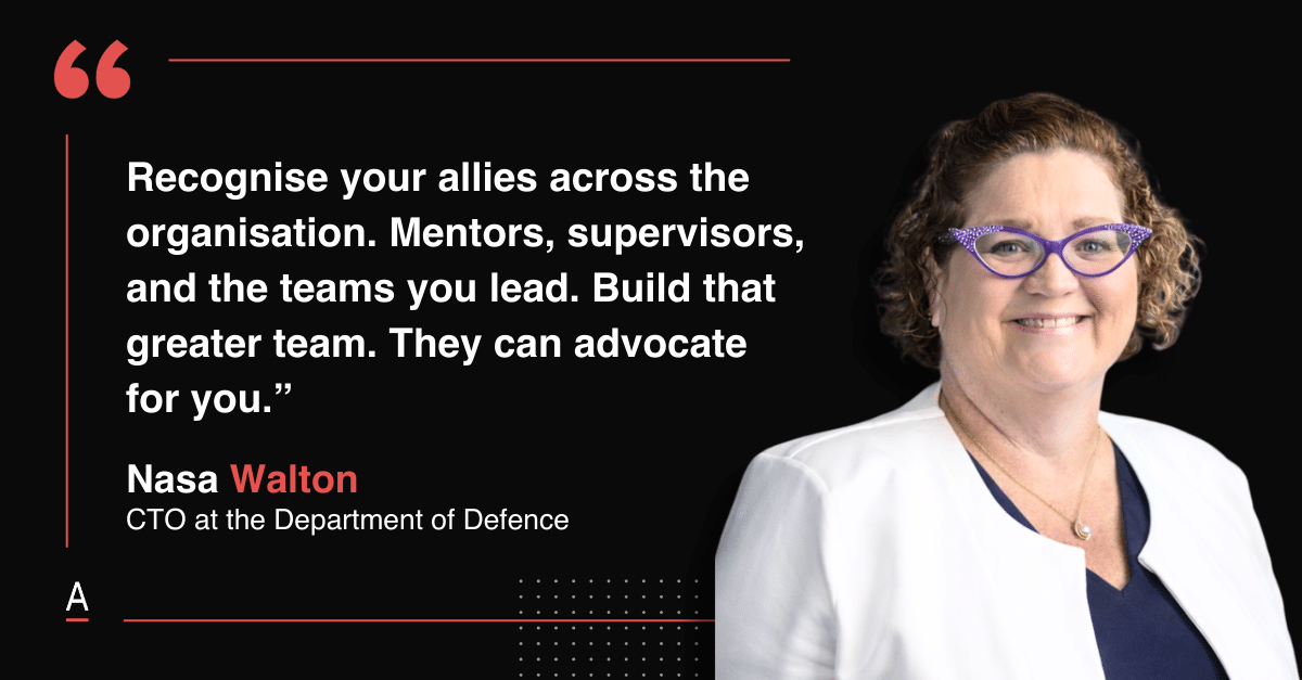 Nasa Walton, Chief Technology Officer at the Department of Defence, reinforced that advocacy does not only come from formal sponsors, it can come from mentors, supervisors, peers, and the wider teams you work with.